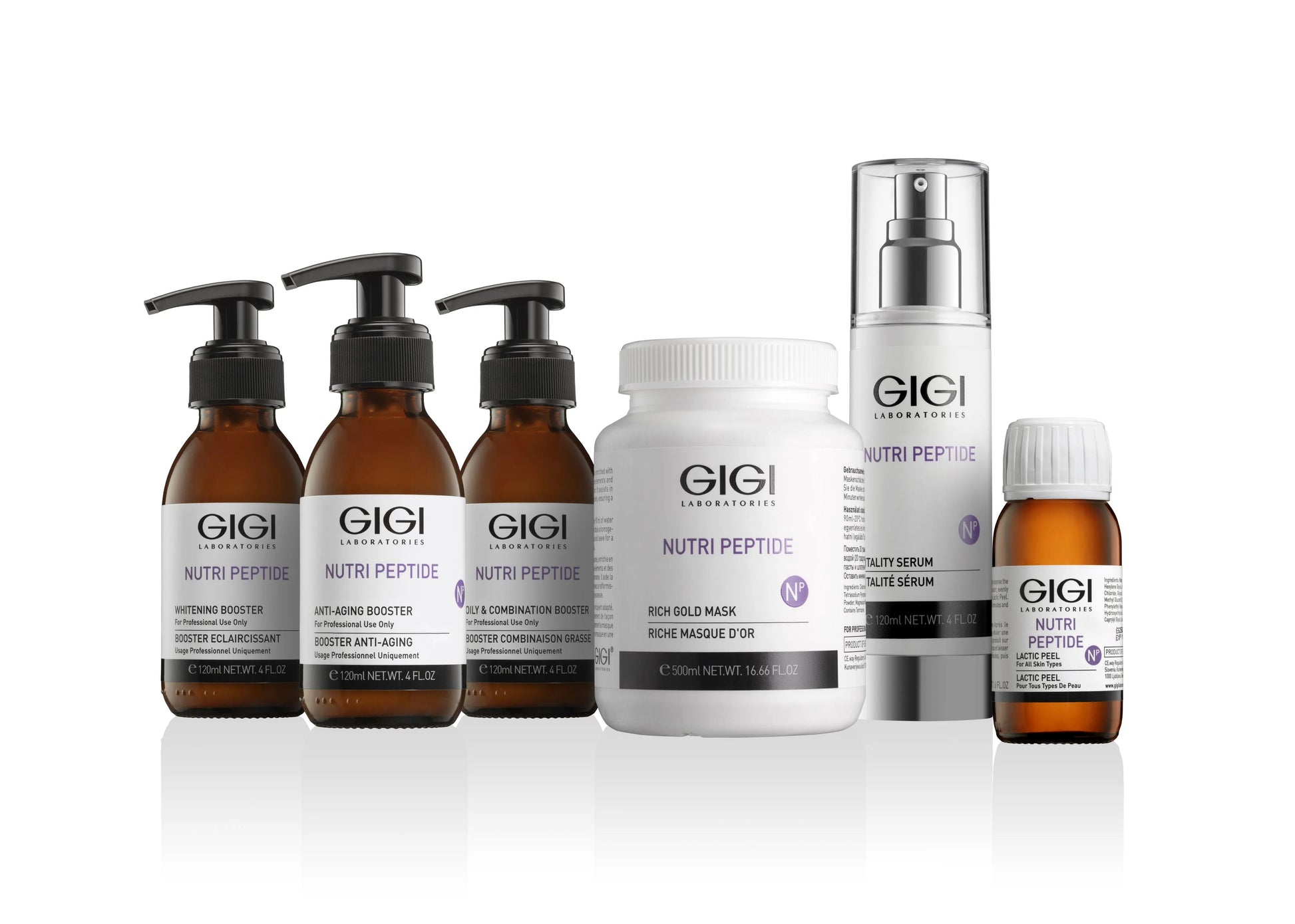 The GIGI Nutri Peptide 3-Booster Treatment Set is a professional salon kit designed to address different skin concerns through the advanced peptide-therapy technology of the Nutri Peptide line. Each booster is formulated for a specific skin profile: